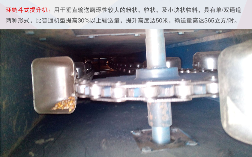 環(huán)鏈斗式提升機(jī)采用圓環(huán)鏈條作為其牽引構(gòu)件,主要用于垂直輸送磨琢性較大的粉狀、粒狀、及小塊狀物料,具有單/雙通道兩種形式,比普通機(jī)型提高30%以上輸送量,提升高度達(dá)50米,輸送量高達(dá)365立方/時(shí)。