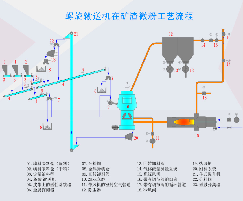 烘干后的磨渣進入磨機進行粉磨,粉磨出來的渣粉經過選粉機進行篩選后,與磨機渣粉由螺旋輸送機送回磨機繼續粉磨,與磨機形成閉路循環,合格的渣粉有螺旋輸送機送至成品倉。