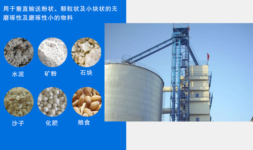 鏈式提升機可用于垂直輸送粉狀、顆粒狀及小塊狀的無磨琢性及磨琢性小的物料,如水泥、礦粉、石塊、沙子、化肥、糧食等。