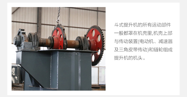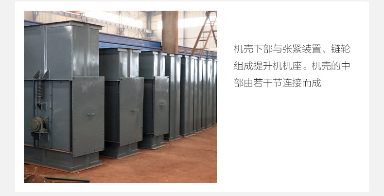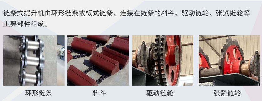 鏈條式提升機由環形鏈條或板式鏈條、連接在鏈條的料斗、驅動鏈輪、張緊鏈輪等主要部件組成。斗式提升機的所有運動部件一般都罩在機殼里,機殼上部與傳動裝置(電動機、減速器及三角皮帶傳動)和鏈輪組成提升機的機頭。機殼下部與張緊裝置、鏈輪組成提升機機座。機殼的中部由若干節連接而成。