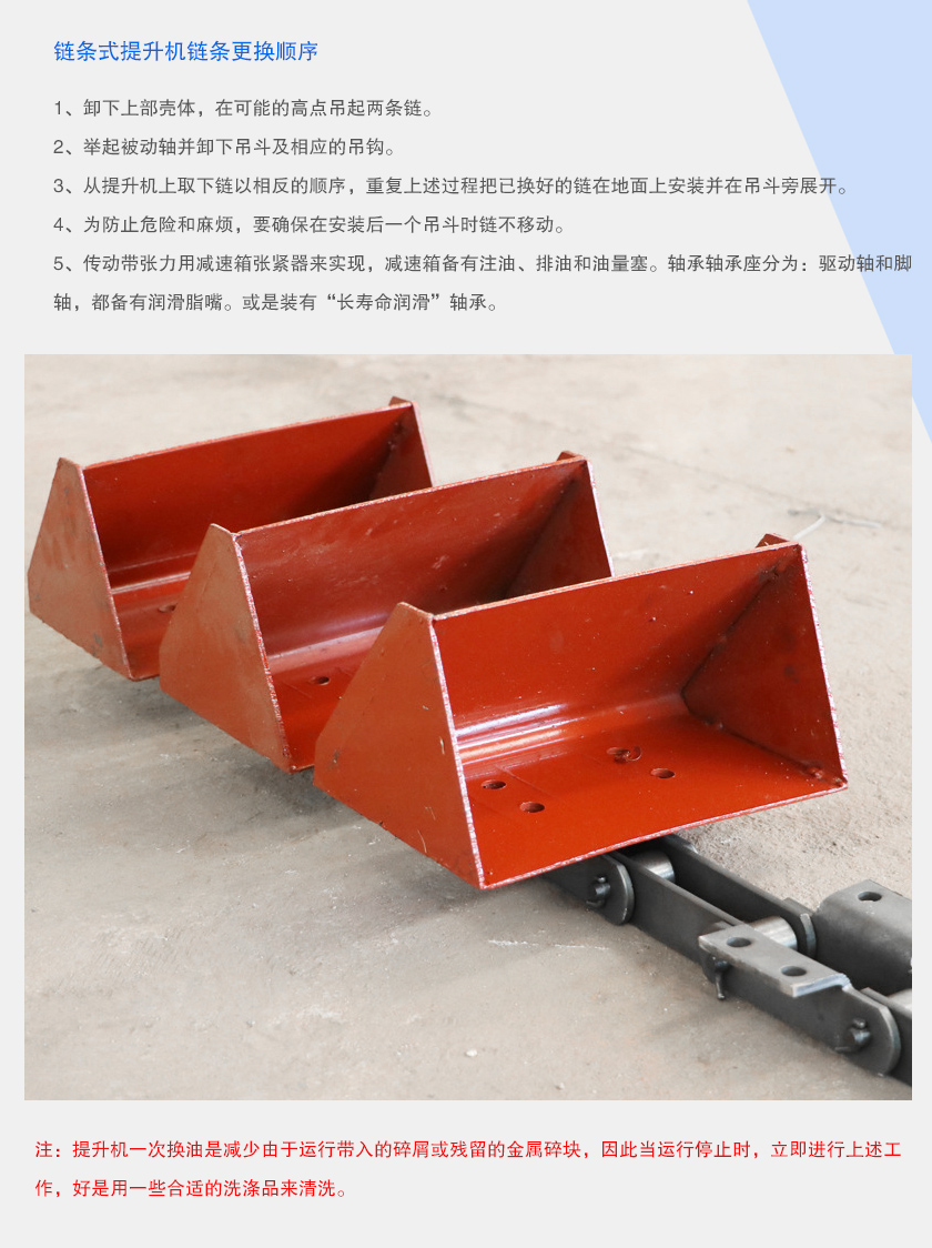 鏈條式提升機工作時,料斗將物料從下面的儲藏中舀起,隨著鏈條提升到頂部,繞過頂輪后向下翻轉將物料傾入接受槽內,完成對物料的提升過程。