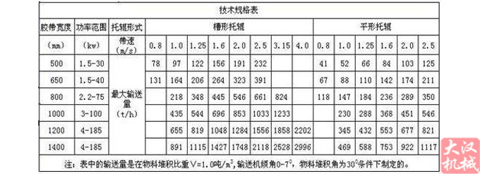 水平皮帶輸送機按其支架結構有固定式、移動式兩種:按輸送帶材料有膠帶、塑料帶和鋼芯帶之分。皮帶輸送機的工作環境溫度一般在-10°C--+40°C之間,要求物料溫度不超過70°C;耐熱橡膠帶可輸送120°C以下的高溫物料。物料溫度更高時不宜采用膠帶輸送機。當輸送具有酸性堿性油類物質和有機溶劑等成分的物料時,需采用耐油、耐酸堿的橡膠帶式塑料帶。帶式輸送機的帶寬可分為:500、650、800、1000、1200和1400mm。用戶可根據帶式輸送機的輸送長度,物料的種類、容重、輸送量、輸送長度等諸因素通過計算確定輸送機的布局以及所選用的膠帶寬度、帆布層數和膠帶厚度。