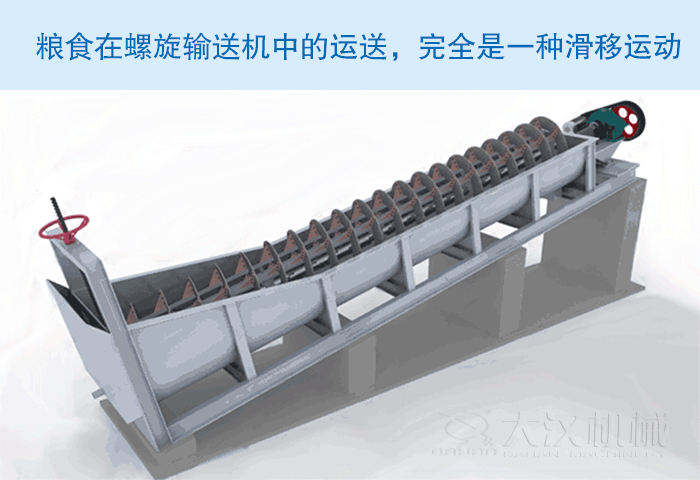 糧食螺旋輸送機(jī)是利用旋轉(zhuǎn)的螺旋葉片將糧食推移而進(jìn)行輸送,使物料與螺旋葉片一起旋轉(zhuǎn)的力是物料自身重量和螺旋輸送機(jī)機(jī)殼對物料的摩擦阻力。糧食在中間軸承的運(yùn)移,則是依靠后面前進(jìn)著的物料的推力。所以,糧食在螺旋輸送機(jī)中的運(yùn)送,完全是一種滑移運(yùn)動。