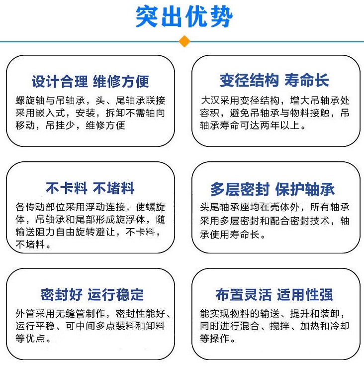 以上是對(duì)螺旋輸送機(jī)的介紹,產(chǎn)品規(guī)格有(管型、U型)(單軸、無軸),外殼葉片材質(zhì):碳鋼、不銹鋼,根據(jù)被輸送物料的粒度、輸送量和輸送距離,合理選擇和設(shè)計(jì),做到不堵塞、不起拱、出料順暢。