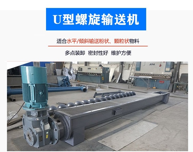 U型螺旋輸送機是在料槽橫截面為“U”型的料槽中水平/小傾角輸送產品。