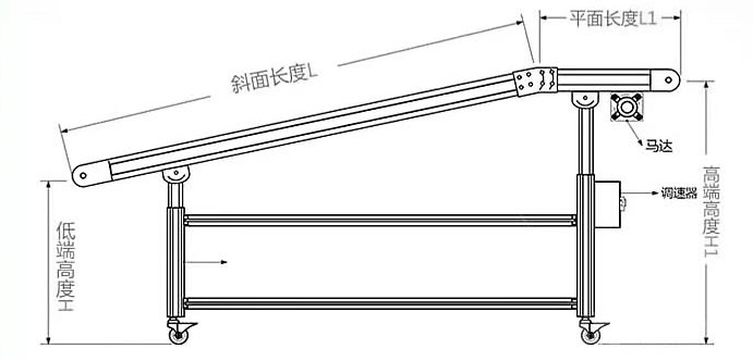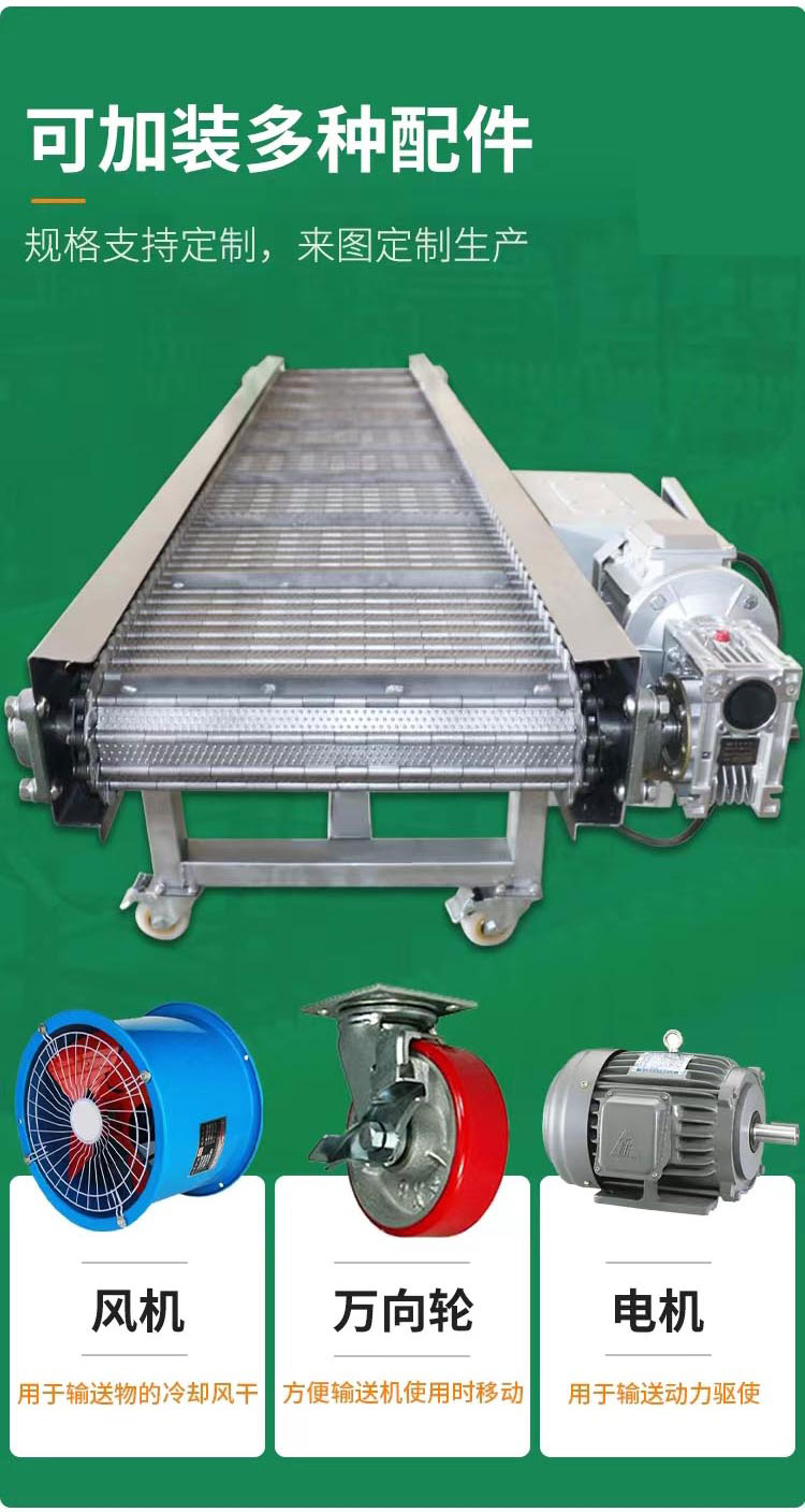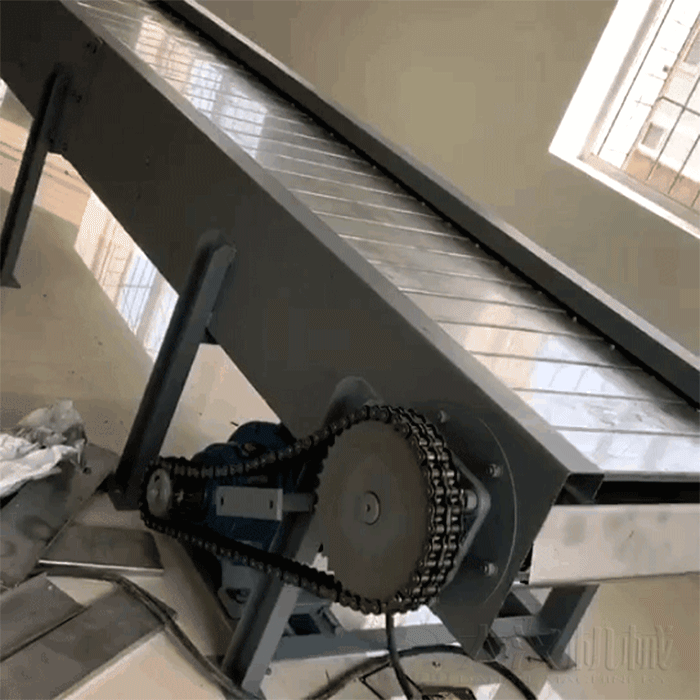 鏈板輸送機(jī)由電機(jī)、傳動(dòng)軸、鏈輪、鏈條、軸承、潤(rùn)滑劑、鏈板、滾筒、張緊設(shè)備、等組成。其中鏈條和鏈板主要起到帶動(dòng)產(chǎn)品運(yùn)動(dòng)的作用。鏈條使用循環(huán)往復(fù)運(yùn)動(dòng)提供了牽引動(dòng)力,金屬板是承載體,在鏈條牽引力的作用下承載物料沿著水平或傾斜方向輸送。