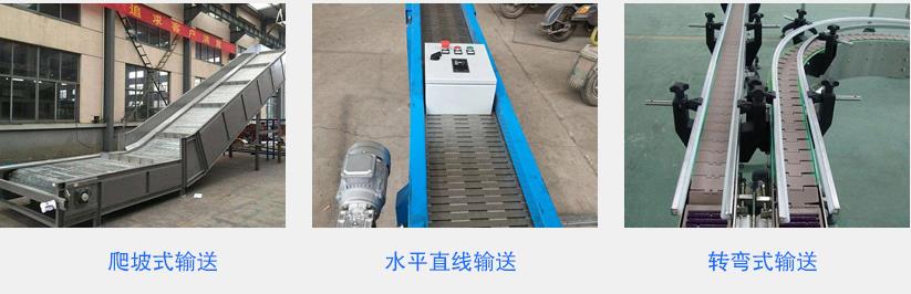 鏈板輸送機可根據您的需要選取不同寬度、不同形狀的鏈板來完成平面輸送、平面轉彎、提升、下降等要求,具體需要根據定制情況決定。