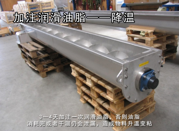 有些物料在溫度達到一定程度時會改變性質變得有粘性,這是因為物料與螺旋葉片和螺旋管壁的摩擦會產生一定的溫升,螺旋傳動軸頭也會在工作過程中產生一定溫度,如果因為升溫而變的有粘性,勢必會造成螺旋輸送機不能正常工作,所以要有正確的處理方法就是一般主要依靠加注油潤滑而對螺旋輸送機的內部進行降溫。