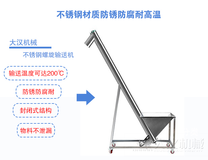 在食品行業的對于機械設備的選用有著嚴格的衛生要求,大漢生產的不銹鋼螺旋輸送機整機經過嚴格的拋光處理無毛刺,焊接之處也經過打磨而成,這樣就能夠保證物料不會因為殘留物,而出現腐壞的現象,在清理方面也是非常的容易,所以不銹鋼螺旋輸送機相比普通碳鋼材質的螺旋輸送機更耐用。